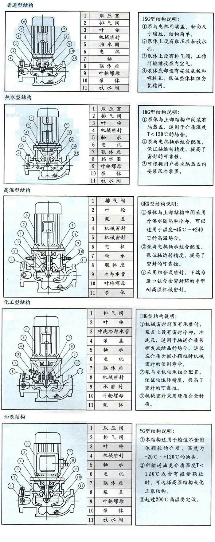 2、IRG(GRG)型立式热水(高温)循环泵广泛适用于:能源、冶金、化工、纺织、造纸,以及宾馆饭店等锅炉高温热水增压循环输送及城市采用暖系统循环用泵,IRG型使用温度T<120℃,GRG型使用温度T<240℃。